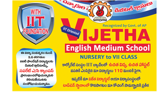 Vijetha IIT Concept School has made an immeasurable contribution to the educational scenario with an uncompromising association of directors Mr. M. Srinivasa Rao, Mr.N. Suresh, Mr. E. Girish Babu, Mr. K. Harikrishna, Mr. K. Brahmaiah and Mr. E. Lakshmi Narayana whose leadership is remarkable in providing quality education in the surrounding areas of the Guntur District. Vijetha gives top priority to I.I.T. and Medicon, backed up by powerful communication skills, strict discipline, and character building.